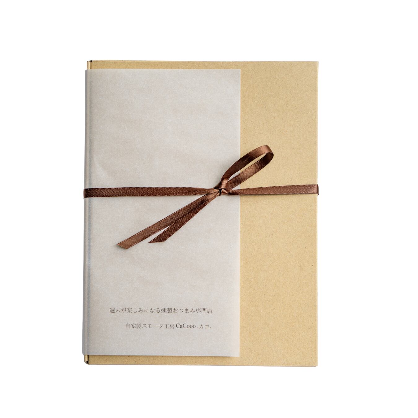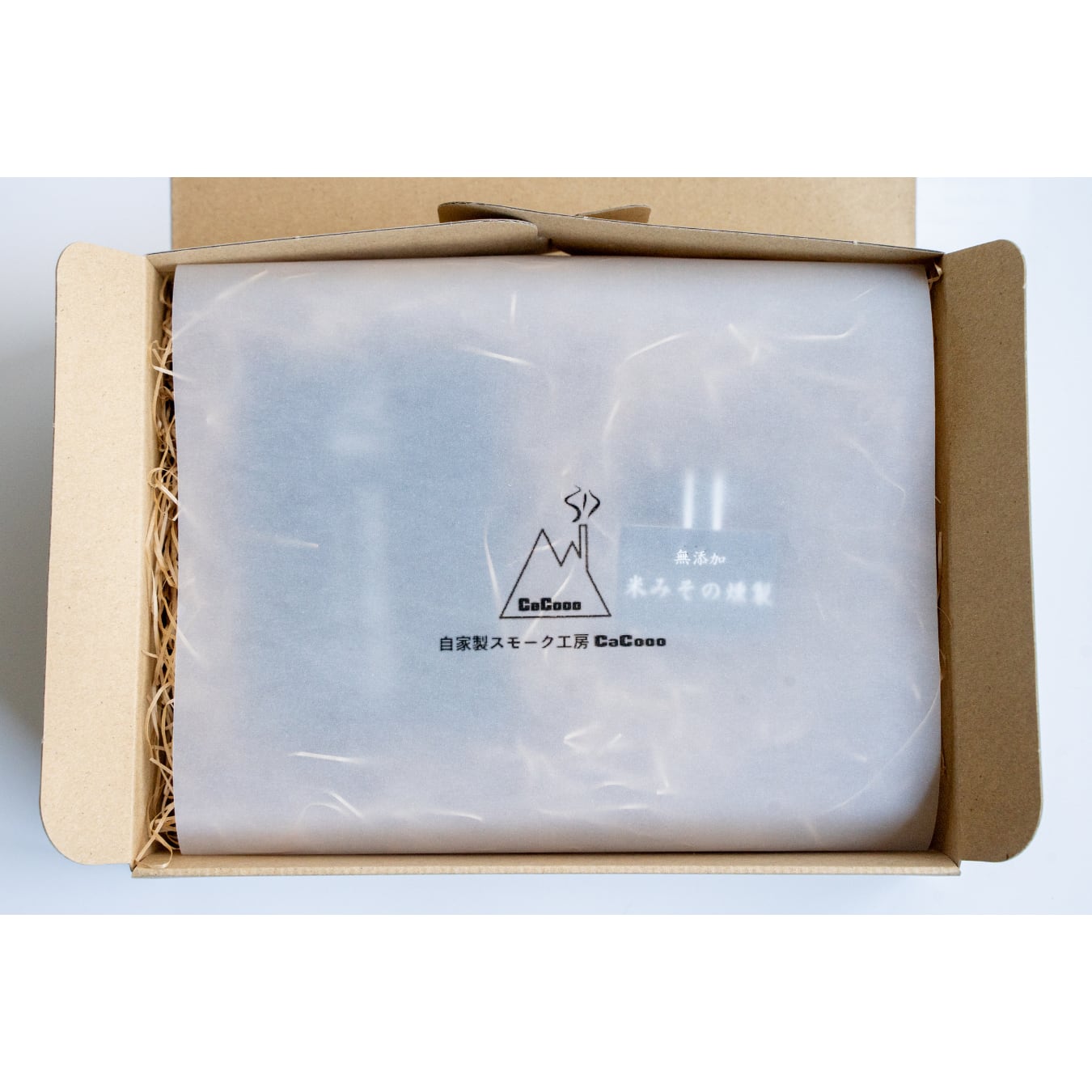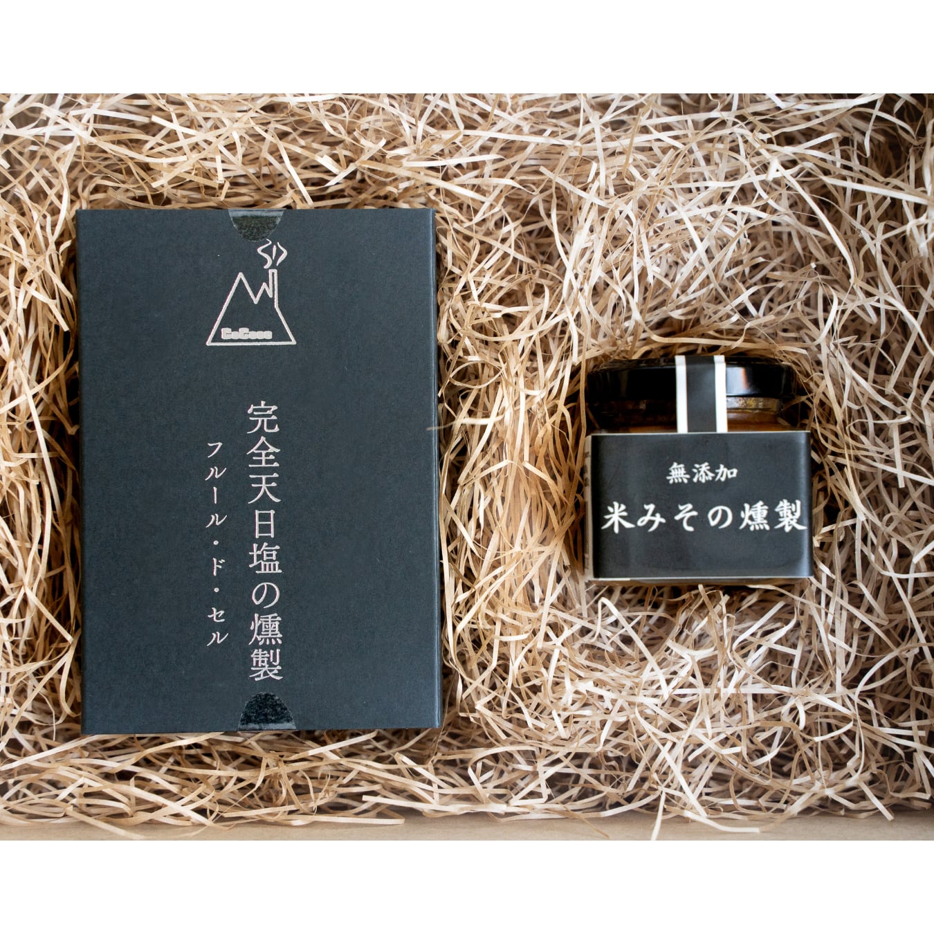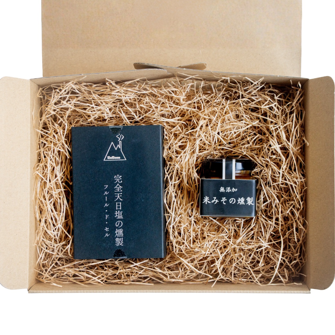 CaCoooの人気商品「完全天日塩の燻製」と「米みその燻製」をセットにした燻製調味料のギフトボックスです。